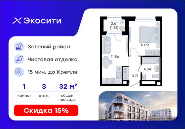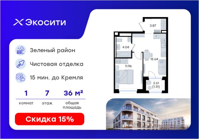 Продается 1-комн. квартира на 8-м этаже в строящемся проекте Экосити. Общая площадь лота составляет 33,86 кв. м, из которых 10,55 кв. м отведено под жилую и 14,89 кв. м под кухонную зону. Номер квартиры - 403 Преимущества квартиры в Урбан-квартале: • Квартира с полностью чистовой отделкой. В комнатах и коридоре: - натяжной потолок, - стены оклеены обоями под покраску, - полы: ламинат, плинтусы и напольная плитки - установлены межкомнатные двери и подоконники. В санузлах: - на стенах - керамогранитная плитка и/или окраска водостойкой краской - на полу - керамогранитная плитка; - натяжной потолок - сантехника: ванна и экран под ванну/душевой поддон, унитаз, раковины и смесители, монтаж водопровода и канализации - Предусмотрен расширенный пакет системы Умный Дом: бесключевой доступ в подъезд, видеодомофон с функцией Face ID, видеонаблюдение, автоматизированный сбор и передача показаний счётчиков; - На территории Урбан-квартала предусмотрено строительство детского сада на 360 мест, школы на 1501 место, детский развивающий центр на 2000 мест. - Рядом с с кварталом Резиденции запланировано строительство детского сада на 360 мест, школы с детским развивающим центром на 1501 место - На первых этажах домов Урбан-квартала запроектированы коммерческие помещения - предусмотрены места для супермаркетов, бытовых услуг, кафе. - Собственный комьюнити-центр для жителей Урбан-квартала - Клуб Резидентов для жителей квартала Резиденции - бульвар "Река между камней" с плейхабом для детей, амфитеатром, спортивными зонами, аллеей достижений. Всем посетителям будет доступен иммерсивный маршрут и AR-игры. - Тайная тропа вдоль которой расположатся зоны тихого отдыха, йоги и медитаций - 2 смотровые площадки - Снейк-ран - Круговой спортивный маршрут - Специальные зоны для выгула собак - В Урбан-квартале предусмотрено строительство 2 многоэтажных паркингов на 300 и 360 машиномест. Всем жителям проекта доступен и привычный плоскостной паркинг вокруг территории проекта с возможностью в приложении дома получить информацию о наличии парковочных мест. - В квартале Резиденции предусмотрен подземный паркинг на 260 машиномест Экосити — это совершенство города в первозданной природе. Наполненный возможностями квартал, в котором вы не выбираете между городом или природой, семьей или работой, отдыхом или спортом, — вы берете всё сразу. Каждая семья, каким бы составом она ни жила, найдет для себя идеальное пространство. Планировочные решения разнообразны, также как и возможности отделки от черновой до полностью с ремонтом. Здесь запроектированы квартиры с просторной кухней-гостиной, чтобы семья могла комфортно проводить время вместе. Квартиры сдаются с современной качественной отделкой, что позволяет после сдачи дома сразу начать жить, избежав долгих самостоятельных ремонтов. Цветовые решения и стиль отделки можно выбрать при покупке квартиры. Резиденции сдаются в черновой отделке, вы могли реализовать ваши самые смелые дизайнерские решения. Каждая резиденция это баз