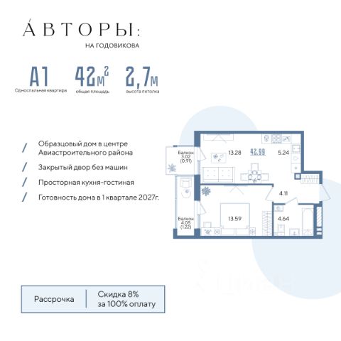 Вы можете приобрести эту квартиру в ипотеку с первоначальным взносом от 2,3 млн рублей и ежемесячным платежом от 23.000 рублей (ипотека для всех) или от 75 тыс. рублей (семейная ипотека) Подробнее - звоните! Продается 1-к квартира 157 в образцовом доме "Авторы на Годовикова" в центре Авиастроительного района. Квартира на 12 этаже площадью 45.63 м², кухней-гостиной и высотой потолков 2.7 м. Квартира сдается в предчистовой отделке со стяжкой полов, предоставляя полную свободу для ваших предпочтений в дизайне. Срок сдачи дома — 1-й квартал 2027 года. Возможно приобретение со скидкой 8% при полной оплате(акция действительная до 31.07.2026г.), в рассрочку с первым взносом 30%, а также оформление стандартной ипотеки по интересным условиям. Образцовый дом "Авторы на Годовикова" расположен в тихой зоне, удаленной от активной дороги — на второй линии от улицы Максимова. Соседство с невысокими частными домами открывает превосходный вид из квартиры. Для прогулок на свежем воздухе в шаговой доступности Караваевский парк и парк "Крылья Советов". В соответствии с современными стандартами комфорт-класса "Авторы" предлагают особые решения для вашего комфорта: • Современная архитектура. • Закрытый двор без машин. • Дизайнерские холлы с зонами ожидания и детской комнатой. • Подземный паркинг. • Зона для хвостатых. Двор в концепции траектории полета создает единую линию движения. На территории дома есть многофункциональная зона для йоги и настольных игр, детская зона для комфортных прогулок юных жителей, многофункциональная спортивная площадка со скалолазанием и площадка для выгула собак. Обильное озеленение из 25 видов растений и несколько игровых зон для юных жителей разных возратов: для детей до 3-х лет — песочница, горка и качели; для детей от 4 до 14 лет — большой игровой комплекс, включающий горки, качели, карусели, переговорные трубы и мягкую геопластику, в которой прячутся тоннели. Компания "Авторы" — девелопер на рынке высококлассной недвижимости Казани. Как самостоятельный застройщик компания работает с 2022 года, а в начале 2024 года успешно сдали свой первый проект ЖК "Дом у озера", где 96% квартир были приняты дольщиками с первого раза и без критичных замечаний. Компания входит в ТОП-5 застройщиков РТ по потребительским качествам ЕРЗ. Сейчас компания ведет строительство проектов на ул. Большая, ул. Петербургская, ул. Годовикова и ул. Астрономическая