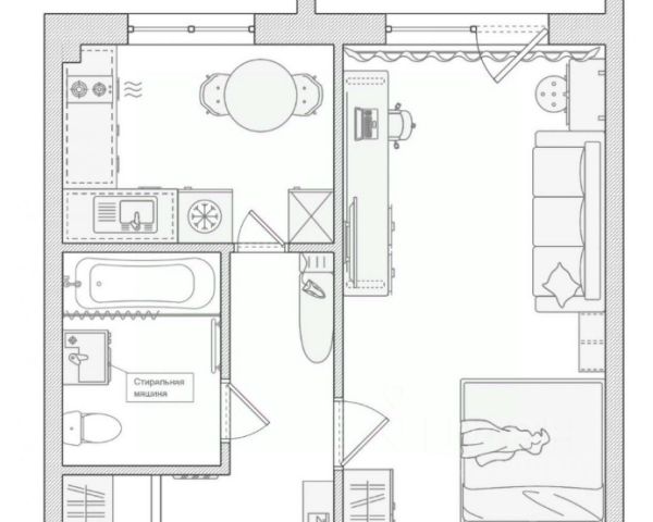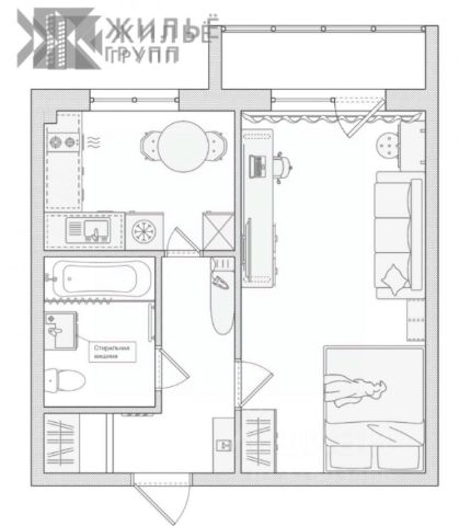 Квартира разделена на две изолированные комнаты правильной формы площадью 17 кв.м и 11,5 кв.м, что позволяет комфортно организовать пространство — например, обустроить спальную зону и просторную гостиную-кухню.