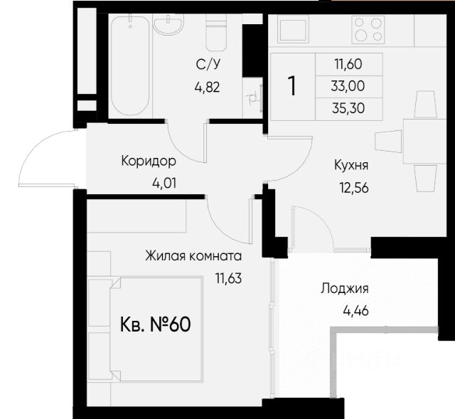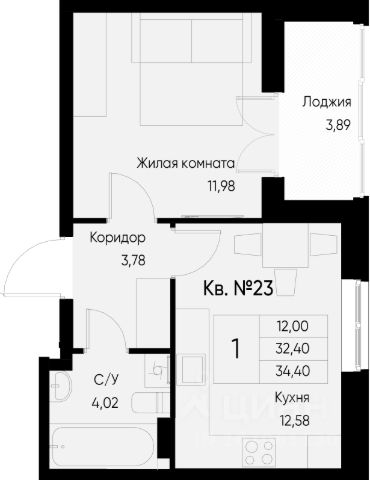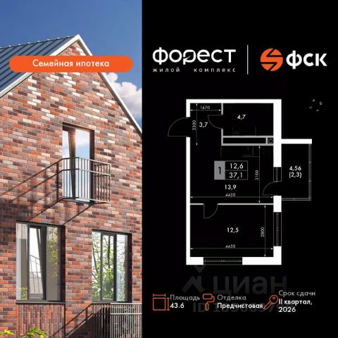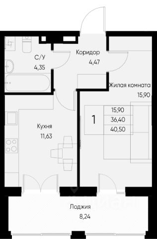 Общая площадь квартиры с учетом лоджии 43,4 м2.