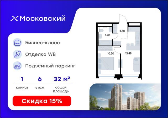 Продается 1-комн. квартира на 6-м этаже в квартале бизнес-класса Московский. Общая площадь лота составляет 33,74 кв. м, из которых 10,34 кв. м отведено под жилую и 14,13 кв. м под кухонную зону. Номер квартиры - 44 Московский это идеальное сочетание динамики мегаполиса и камерности района, где каждое утро начинается легко, а каждый вечер наполнен ощущением дома Преимущества квартиры: евро-двухкомнатная квартира; остекленная лоджия; вид во двор. Преимущества, которые изменят вашу жизнь: • Собственная инфраструктура: Всё для комфорта и досуга, не выходя за территорию проекта • Безопасность 24/7: Закрытая территория, видеонаблюдение, система "Умный дом" • Безбарьерная среда: Забота о каждом жителе, независимо от возраста • Футуристичные лобби: Эстетика и комфорт с первых шагов в вашем доме. • Колясочные в каждой секции: Больше пространства в ваших квартирах • Квартиры в отделке White Box: Готовый холст для реализации дизайнерских идей. • Благоустройство в стиле лесопарка: эко-пространство, где природа становится частью повседневной жизни. Московский это проект бизнес-класса для тех, кто живёт в ритме большого города, но ждёт безмятежности у себя дома. Здесь всё важное происходит рядом с вами: работа, встречи, спортивные и культурные активности, прогулки, образование и обучение. Здесь вы ощутите, что вы наконец-то дома — в доме, которого давно ждали. Узнайте подробности в отделе продаж!