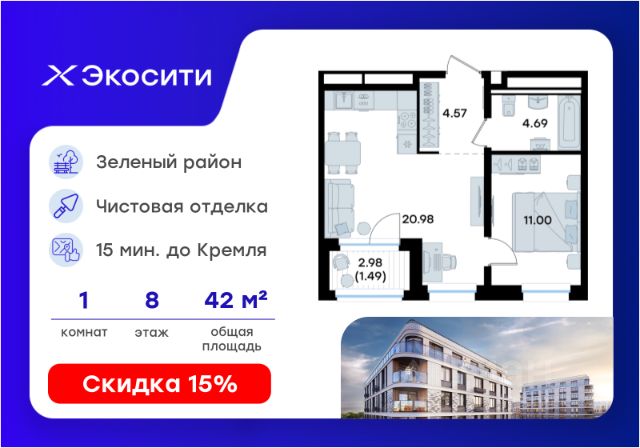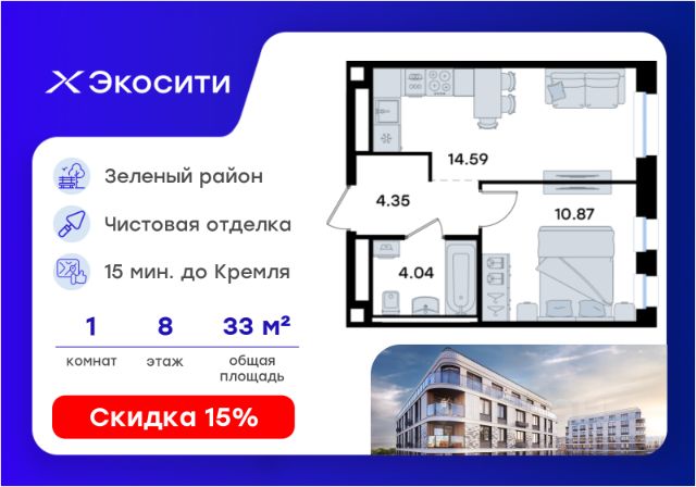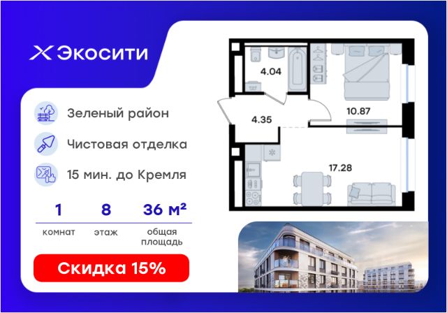 Продается 1-комн. квартира на 8-м этаже в строящемся проекте Экосити. Общая площадь лота составляет 33,86 кв. м, из которых 10,55 кв. м отведено под жилую и 14,89 кв. м под кухонную зону. Номер квартиры - 403 Преимущества квартиры в Урбан-квартале: • Квартира с полностью чистовой отделкой. В комнатах и коридоре: - натяжной потолок, - стены оклеены обоями под покраску, - полы: ламинат, плинтусы и напольная плитки - установлены межкомнатные двери и подоконники. В санузлах: - на стенах - керамогранитная плитка и/или окраска водостойкой краской - на полу - керамогранитная плитка; - натяжной потолок - сантехника: ванна и экран под ванну/душевой поддон, унитаз, раковины и смесители, монтаж водопровода и канализации - Предусмотрен расширенный пакет системы Умный Дом: бесключевой доступ в подъезд, видеодомофон с функцией Face ID, видеонаблюдение, автоматизированный сбор и передача показаний счётчиков; - На территории Урбан-квартала предусмотрено строительство детского сада на 360 мест, школы на 1501 место, детский развивающий центр на 2000 мест. - Рядом с с кварталом Резиденции запланировано строительство детского сада на 360 мест, школы с детским развивающим центром на 1501 место - На первых этажах домов Урбан-квартала запроектированы коммерческие помещения - предусмотрены места для супермаркетов, бытовых услуг, кафе. - Собственный комьюнити-центр для жителей Урбан-квартала - Клуб Резидентов для жителей квартала Резиденции - бульвар "Река между камней" с плейхабом для детей, амфитеатром, спортивными зонами, аллеей достижений. Всем посетителям будет доступен иммерсивный маршрут и AR-игры. - Тайная тропа вдоль которой расположатся зоны тихого отдыха, йоги и медитаций - 2 смотровые площадки - Снейк-ран - Круговой спортивный маршрут - Специальные зоны для выгула собак - В Урбан-квартале предусмотрено строительство 2 многоэтажных паркингов на 300 и 360 машиномест. Всем жителям проекта доступен и привычный плоскостной паркинг вокруг территории проекта с возможностью в приложении дома получить информацию о наличии парковочных мест. - В квартале Резиденции предусмотрен подземный паркинг на 260 машиномест Экосити — это совершенство города в первозданной природе. Наполненный возможностями квартал, в котором вы не выбираете между городом или природой, семьей или работой, отдыхом или спортом, — вы берете всё сразу. Каждая семья, каким бы составом она ни жила, найдет для себя идеальное пространство. Планировочные решения разнообразны, также как и возможности отделки от черновой до полностью с ремонтом. Здесь запроектированы квартиры с просторной кухней-гостиной, чтобы семья могла комфортно проводить время вместе. Квартиры сдаются с современной качественной отделкой, что позволяет после сдачи дома сразу начать жить, избежав долгих самостоятельных ремонтов. Цветовые решения и стиль отделки можно выбрать при покупке квартиры. Резиденции сдаются в черновой отделке, вы могли реализовать ваши самые смелые дизайнерские решения. Каждая резиденция это баз