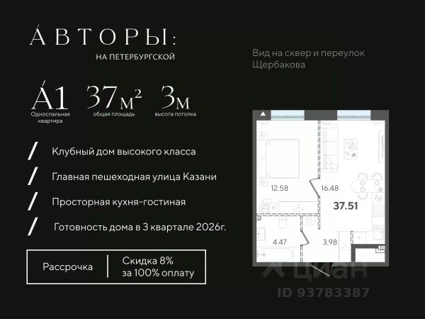 Вы можете приобрести эту квартиру в рассрочку с первоначальным взносом 30% и ежемесячным платежом 50 000 рублей. Подробнее - звоните!* Продается 1-к квартира 56 в клубном доме "Авторы на Петербургской" на главной пешеходной улице Казани. Квартира на 3 этаже площадью 37,51 м², высотой потолков 3 м. Квартира сдается в свободной планировке, предоставляя полную свободу для ваших предпочтений в дизайне и возможность подстроить пространство под ваши жизненные ценности. Срок сдачи дома — 3-й квартал 2026 года. В клубном доме всего 68 квартир, включая 18 эксклюзивных пентхаусов. Возможно приобретение со скидкой 6% при полной оплате, в рассрочку с первым взносом 50% или 30%, а также оформление ипотеки. Клубный дом "Авторы на Петербургской" расположен на главной пешеходной улице Казани в 3-х минутах до набережной озера "Нижний Кабан". Вы находитесь в самом центре: можно выйти из дома и быстро добраться в любую часть города, даже в час пик. В соответствии с современными стандартами бизнес-класса "Авторы" предлагают особые решения для вашего комфорта: • Закрытая территория с круглосуточным видеонаблюдением. • Подземный паркинг с электрозаправками, келлеры для хранения, умный въезд с распознаванием номеров. • Натуральные коллекционные материалы в лобби для создания атмосферы премиум-класса. Двор-патио с эффектом контепорари наполняет территорию дома тишиной и эстетикой, где каждый элемент выглядит как арт-объект, превращая двор в музей современного искусства. Также в пространстве дома есть детская зона — шалаш, где юные жители смогут придумать сотню новых игр с друзьями, а взрослые будут уверены в их безопасности. *Возможно удорожание квартиры на 10% Компания "Авторы" — девелопер на рынке высококлассной недвижимости Казани. Как самостоятельный застройщик компания работает с 2022 года, а в начале 2024 года успешно сдали свой первый проект ЖК "Дом у озера", где 96% квартир были приняты дольщиками с первого раза и без критичных замечаний. Компания входит в ТОП-5 застройщиков РТ по потребительским качествам ЕРЗ. Сейчас компания ведет строительство проектов на ул. Большая, ул. Петербургская, ул. Годовикова и ул. Астрономическая Цены на евродвушку в новостройке в районе Вахитовский в городе Казань.