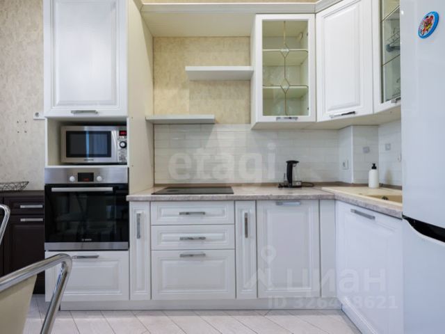 Большая комната правильной формы площадью 16,8 кв м, просторная кухня - 13,5 кв м со встроенной мебелью из МДФ и встроенной техникой.