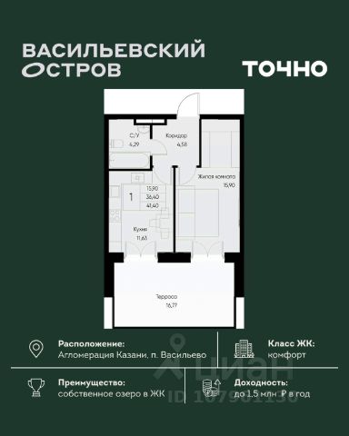 ГОРОД-ПАРК "ЗЕЛЁНАЯ ДОЛИНА" строится в экологичном пригороде Казани - всего в 15 минутах езды от города по обновленному Горьковскому шоссе. Это полноценный город с живописным окружением, свежим воздухом и всей необходимой инфраструктурой: - комплекс комфорт-класса из 17 домов со своим детсадом, торговым центром, фитнес-центром с бассейном, spa, банным комплексом, - огромный парк 3,5 га с озером, барбекю-зоной, спортивными кортами, воркаутом, - частный детский сад "Уникум Land" на 120 мест с центром развития на 100 мест с логоритмикой, нейрогимнастикой на сиббордах, - 2 лицея в шаговой доступности, - фреш-кафе с открытой летней террасой, - "закрытые дворы" с игровыми и спортивными комплексами, видеонаблюдением и ландшафтным дизайном, - большой выбор 1-, 2-, 3-комнатных квартир с одной и двумя спальнями, большими кухнями и гардеробными, - дома строятся из кирпича с толщиной стен в полметра (510 мм), поэтому квартиры очень тёплые, - в квартирах выполнена качественная предчистовая отделка White box или готовый ремонт, - все квартиры оснащены индивидуальным отоплением, поэтому вы сможете сами регулировать температуру в своей квартире и коммунальные платежи, - свое комьюнити с кинопоказами, фитнес-тренировками, фестивалями, - заботливая Управляющая компания на связи с жителями 24/7, - большой уличный паркинг с бесплатными местами. Кстати, сейчас на покупку квартир в ГОРОДЕ-ПАРКЕ "ЗЕЛЁНАЯ ДОЛИНА" действует уникальная программа рассрочки без % на 36 месяце на строящиеся и сданные дома! Вы сможете сразу заехать в свою новую квартиру. Начните новую жизнь в ритме большого города и в балансе с природой! 1-комнатная квартира в новостройке в Зеленодольском районе республики Татарстан.
