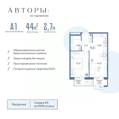 Вы можете приобрести эту квартиру в ипотеку со ставкой от 6% (семейная ипотека). Новоселье уже в этом году! Подробнее - звоните! Продается 1-к квартира 129 в образцовом доме "Авторы на Годовикова" в центре Авиастроительного района. Квартира на 8 этаже площадью 45.63 м², кухней-гостиной и высотой потолков 2.7 м. Квартира сдается в предчистовой отделке со стяжкой полов, предоставляя полную свободу для ваших предпочтений в дизайне. Срок сдачи дома — 1-й квартал 2027 года. Возможно приобретение со скидкой 5% при полной оплате, в рассрочку с первым взносом 30%, а также оформление стандартной ипотеки по интересным условиям. Образцовый дом "Авторы на Годовикова" расположен в тихой зоне, удаленной от активной дороги — на второй линии от улицы Максимова. Соседство с невысокими частными домами открывает превосходный вид из квартиры. Для прогулок на свежем воздухе в шаговой доступности Караваевский парк и парк "Крылья Советов". В соответствии с современными стандартами комфорт-класса "Авторы" предлагают особые решения для вашего комфорта: • Современная архитектура. • Закрытый двор без машин. • Дизайнерские холлы с зонами ожидания и детской комнатой. • Подземный паркинг. • Зона для хвостатых. Двор в концепции траектории полета создает единую линию движения. На территории дома есть многофункциональная зона для йоги и настольных игр, детская зона для комфортных прогулок юных жителей, многофункциональная спортивная площадка со скалолазанием и площадка для выгула собак. Обильное озеленение из 25 видов растений и несколько игровых зон для юных жителей разных возратов: для детей до 3-х лет — песочница, горка и качели; для детей от 4 до 14 лет — большой игровой комплекс, включающий горки, качели, карусели, переговорные трубы и мягкую геопластику, в которой прячутся тоннели. Компания "Авторы" — девелопер на рынке высококлассной недвижимости Казани. Как самостоятельный застройщик компания работает с 2022 года, а в начале 2024 года успешно сдали свой первый проект ЖК "Дом у озера", где 96% квартир были приняты дольщиками с первого раза и без критичных замечаний. Компания входит в ТОП-5 застройщиков РТ по потребительским качествам ЕРЗ. Сейчас компания ведет строительство проектов на ул. Большая, ул. Петербургская, ул. Годовикова и ул. Астрономическая Продается 1-комнатная квартира первичка в районе Авиастроительный в городе Казань.