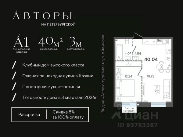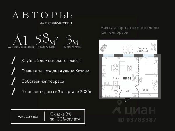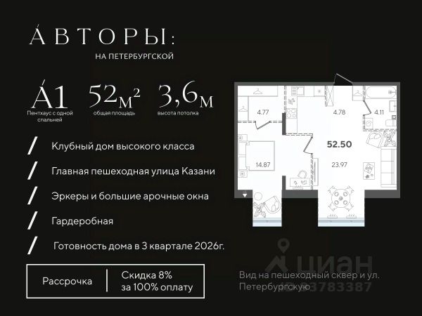 Вы можете приобрести эту квартиру в рассрочку с первоначальным взносом 30% и ежемесячным платежом 50 000 рублей. Подробнее - звоните!* Продается 1-к квартира 56 в клубном доме "Авторы на Петербургской" на главной пешеходной улице Казани. Квартира на 3 этаже площадью 37,51 м², высотой потолков 3 м. Квартира сдается в свободной планировке, предоставляя полную свободу для ваших предпочтений в дизайне и возможность подстроить пространство под ваши жизненные ценности. Срок сдачи дома — 3-й квартал 2026 года. В клубном доме всего 68 квартир, включая 18 эксклюзивных пентхаусов. Возможно приобретение со скидкой 6% при полной оплате, в рассрочку с первым взносом 50% или 30%, а также оформление ипотеки. Клубный дом "Авторы на Петербургской" расположен на главной пешеходной улице Казани в 3-х минутах до набережной озера "Нижний Кабан". Вы находитесь в самом центре: можно выйти из дома и быстро добраться в любую часть города, даже в час пик. В соответствии с современными стандартами бизнес-класса "Авторы" предлагают особые решения для вашего комфорта: • Закрытая территория с круглосуточным видеонаблюдением. • Подземный паркинг с электрозаправками, келлеры для хранения, умный въезд с распознаванием номеров. • Натуральные коллекционные материалы в лобби для создания атмосферы премиум-класса. Двор-патио с эффектом контепорари наполняет территорию дома тишиной и эстетикой, где каждый элемент выглядит как арт-объект, превращая двор в музей современного искусства. Также в пространстве дома есть детская зона — шалаш, где юные жители смогут придумать сотню новых игр с друзьями, а взрослые будут уверены в их безопасности. *Возможно удорожание квартиры на 10% Компания "Авторы" — девелопер на рынке высококлассной недвижимости Казани. Как самостоятельный застройщик компания работает с 2022 года, а в начале 2024 года успешно сдали свой первый проект ЖК "Дом у озера", где 96% квартир были приняты дольщиками с первого раза и без критичных замечаний. Компания входит в ТОП-5 застройщиков РТ по потребительским качествам ЕРЗ. Сейчас компания ведет строительство проектов на ул. Большая, ул. Петербургская, ул. Годовикова и ул. Астрономическая