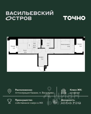 — Общая площадь - 31,3 кв.м, без учета лоджии.