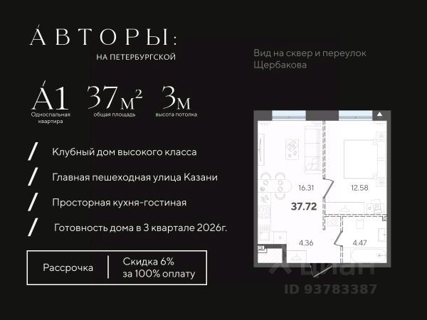 Вы можете приобрести эту квартиру в рассрочку с первоначальным взносом 30% и ежемесячным платежом 50 000 рублей. Подробнее - звоните! Продается 1-к квартира 4 в клубном доме "Авторы на Астрономической" в центре Казани, в шаге от канала Булак. Квартира на 2 этаже площадью 40,76 м², высотой потолков 3 м. Квартира сдается в свободной планировке, предоставляя полную свободу для ваших предпочтений в дизайне и возможность подстроить пространство под ваши жизненные ценности. Срок сдачи дома — 2-й квартал 2027 года. В клубном доме всего 25 квартир от 31м² до 117м². Возможно приобретение с полной оплатой (при полной оплате скидка 5%), в рассрочку с первым взносом 20%, 30% или 50% ( при приобретении в рассрочку с первым взносом 50% возможна скидка до 5% от стоимости), а также оформление ипотеки. Клубный дом "Авторы на Астрономической" в историческом центре Казани, в пешей доступности от Кремля и главных достопримечательностей города. Вы находитесь в самом центре: можно выйти из дома и быстро добраться в любую часть города, даже в час пик. В соответствии с современными стандартами бизнес-класса "Авторы" предлагают особые решения для вашего комфорта: • Тактильная натуральная архитектура из ригельного кирпича ручной формовки. • Закрытая территория с круглосуточным видеонаблюдением. • Трехсекционный двор с высокорослыми растениями и озеленением по философии Хаяо Миядзаки. • Подземный паркинг с умным въездом (распознавание госномеров). • Астро-лобби с круглосуточным консьержем, зонами отдыха и дизайнерской отделкой из натуральных коллекционных материалов для создания атмосферы высокого класса. Особенным пространством в доме станет арт-зал с проекцией 360, которая предоставляет жителям дома возможность быть свидетелями произведений диджитал-художников, а также организовывать просмотры фильмов в формате приватного кинотеатра не выходя из дома. Компания "Авторы" — девелопер на рынке высококлассной недвижимости Казани. Как самостоятельный застройщик компания работает с 2022 года. В портфеле компании один сданный проект, пять клубных домов на этапе строительства и еще три в разработке. Компания входит в ТОП-5 застройщиков ЕРЗ** РТ по потребительским качествам. Сейчас компания ведет строительство проектов на ул. Большая, ул. Петербургская, ул. Годовикова и ул. Астрономическая.