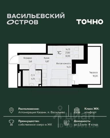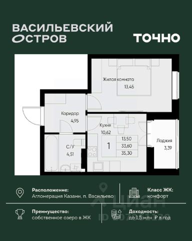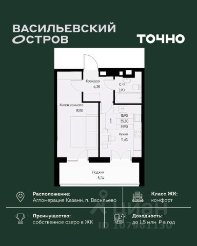 Продаётся уютная однокомнатная квартира площадью 40.9 квадратных метров, расположенная на пятом этаже десятиэтажного монолитного дома 2017 года постройки в живописном Зеленодольском районе, пгт. Васильево, на улице Ленина, дом 17.