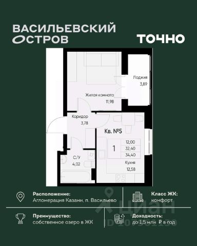 "Полезные Люди" предлагает Вам приобрести однокомнатную квартиру Улучшенной планировки, 34,6 кв.м. общей площади, с ремонтом и мебелью, в г. Зеленодольске, 2003 года постройки.