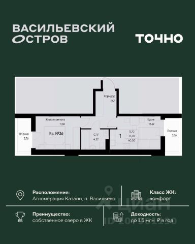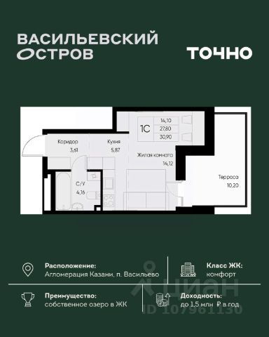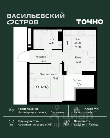 — Общая площадь - 31,3 кв.м, без учета лоджии.