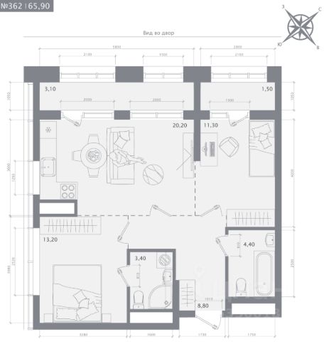 Продаётся 2-комнатная квартира в строящемся доме (Дом 1), срок сдачи: IV-кв. 2027, общей площадью 65.9 кв.м., на 2 этаже.