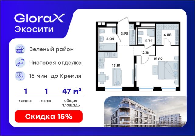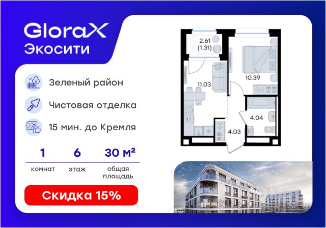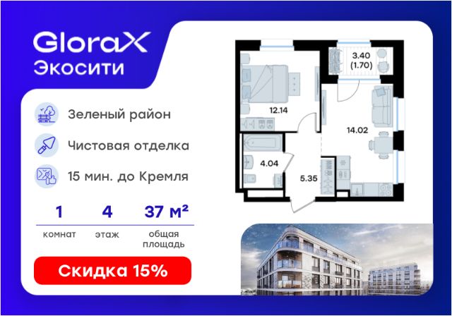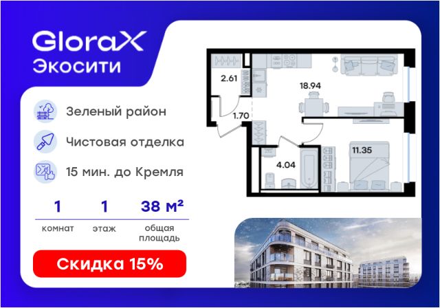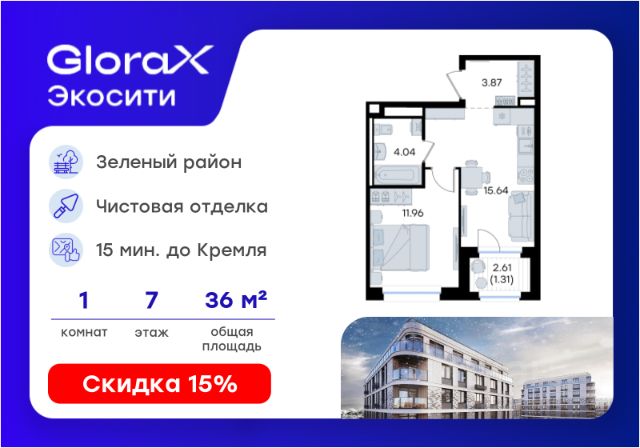Продается 1-комн. квартира на 1-м этаже в строящемся проекте GloraX Экосити. Общая площадь лота составляет 35,64 кв. м, из которых 10,92 кв. м отведено под жилую и 16,25 кв. м под кухонную зону. Номер квартиры - 3 Преимущества квартиры: • Квартира с полностью чистовой отделкой. В комнатах и коридоре: - натяжной потолок, - стены оклеены обоями под покраску, - полы: ламинат, плинтусы и напольная плитки - установлены межкомнатные двери и подоконники. В санузлах: - на стенах - керамогранитная плитка и/или окраска водостойкой краской - на полу - керамогранитная плитка; - натяжной потолок - сантехника: ванна и экран под ванну/душевой поддон, унитаз, раковины и смесители, монтаж водопровода и канализации - Предусмотрен расширенный пакет системы Умный Дом: бесключевой доступ в подъезд, видеодомофон с функцией Face ID, видеонаблюдение, автоматизированный сбор и передача показаний счётчиков; - Внутренние дворы каждого урбан-блока закрытые, благоустройство по индивидуальному проекту. - На территории квартала предусмотрено строительство детского сада на 360 мест, школы на 1501 место, ДОУ на 2000 мест. - На первых этажах домов запроектированы коммерческие помещения - предусмотрены места для супермаркетов, бытовых услуг, кафе. - Собственный комьюнити-центр для жителей жилого комплекса - бульвар "Река между камней" с плейхабом для детей, амфитеатром, спортивными зонами, аллеей достижений. Всем посетителям будет доступен иммерсивный маршрут и AR-игры. - лесная прогулочная аллея вдоль которой расположатся зоны тихого отдыха, йоги и медитаций - 2 смотровые площадки - специальная зона для выгула собак - В жилом комплексе предусмотрено строительство 2 многоэтажных паркингов на 300 и 360 машиномест. Всем жителям проекта доступен и привычный плоскостной паркинг вокруг территории проекта с возможностью в приложении дома получить информацию о наличии парковочных мест. GloraX Экосити — это совершенство города в первозданной природе. Наполненный возможностями район, в котором вы не выбираете между городом или природой, семьей или работой, отдыхом или спортом, — вы берете всё сразу. Каждая семья, каким бы составом она ни жила, найдет для себя идеальное пространство. Планировочные решения запроектированы с просторной кухней-гостиной, чтобы семья могла комфортно проводить время вместе. В целях безопасности в детских комнатах отсутствуют балконы и лоджии. Квартиры сдаются с современной качественной отделкой, что позволяет после сдачи дома сразу начать жить, избежав долгих самостоятельных ремонтов. Цветовые решения и стиль отделки можно выбрать при покупке квартиры. Цена указана при 100% оплате или стандартной ипотеке. Узнайте подробности в Отделе продаж.