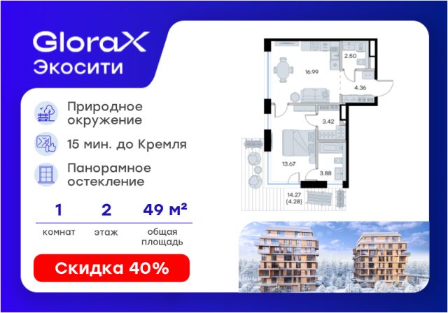 Продается 1-комн. квартира на 8-м этаже в строящемся проекте GloraX Экосити. Общая площадь лота составляет 33,86 кв. м, из которых 10,55 кв. м отведено под жилую и 14,89 кв. м под кухонную зону. Номер квартиры - 403 Преимущества квартиры в Урбан-квартале: • Квартира с полностью чистовой отделкой. В комнатах и коридоре: - натяжной потолок, - стены оклеены обоями под покраску, - полы: ламинат, плинтусы и напольная плитки - установлены межкомнатные двери и подоконники. В санузлах: - на стенах - керамогранитная плитка и/или окраска водостойкой краской - на полу - керамогранитная плитка; - натяжной потолок - сантехника: ванна и экран под ванну/душевой поддон, унитаз, раковины и смесители, монтаж водопровода и канализации - Предусмотрен расширенный пакет системы Умный Дом: бесключевой доступ в подъезд, видеодомофон с функцией Face ID, видеонаблюдение, автоматизированный сбор и передача показаний счётчиков; - На территории Урбан-квартала предусмотрено строительство детского сада на 360 мест, школы на 1501 место, детский развивающий центр на 2000 мест. - Рядом с с кварталом Резиденции запланировано строительство детского сада на 360 мест, школы с детским развивающим центром на 1501 место - На первых этажах домов Урбан-квартала запроектированы коммерческие помещения - предусмотрены места для супермаркетов, бытовых услуг, кафе. - Собственный комьюнити-центр для жителей Урбан-квартала - Клуб Резидентов для жителей квартала Резиденции - бульвар "Река между камней" с плейхабом для детей, амфитеатром, спортивными зонами, аллеей достижений. Всем посетителям будет доступен иммерсивный маршрут и AR-игры. - Тайная тропа вдоль которой расположатся зоны тихого отдыха, йоги и медитаций - 2 смотровые площадки - Снейк-ран - Круговой спортивный маршрут - Специальные зоны для выгула собак - В Урбан-квартале предусмотрено строительство 2 многоэтажных паркингов на 300 и 360 машиномест. Всем жителям проекта доступен и привычный плоскостной паркинг вокруг территории проекта с возможностью в приложении дома получить информацию о наличии парковочных мест. - В квартале Резиденции предусмотрен подземный паркинг на 260 машиномест GloraX Экосити — это совершенство города в первозданной природе. Наполненный возможностями квартал, в котором вы не выбираете между городом или природой, семьей или работой, отдыхом или спортом, — вы берете всё сразу. Каждая семья, каким бы составом она ни жила, найдет для себя идеальное пространство. Планировочные решения разнообразны, также как и возможности отделки от черновой до полностью с ремонтом. Здесь запроектированы квартиры с просторной кухней-гостиной, чтобы семья могла комфортно проводить время вместе. Квартиры сдаются с современной качественной отделкой, что позволяет после сдачи дома сразу начать жить, избежав долгих самостоятельных ремонтов. Цветовые решения и стиль отделки можно выбрать при покупке квартиры. Резиденции сдаются в черновой отделке, вы могли реализовать ваши самые смелые дизайнерские решения. Каждая резиде