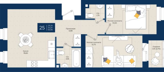 Продаётся 2-комнатная квартира в строящемся доме (дом 1), срок сдачи: III-кв. 2026, общей площадью 55.96 кв.м., на 1 этаже.