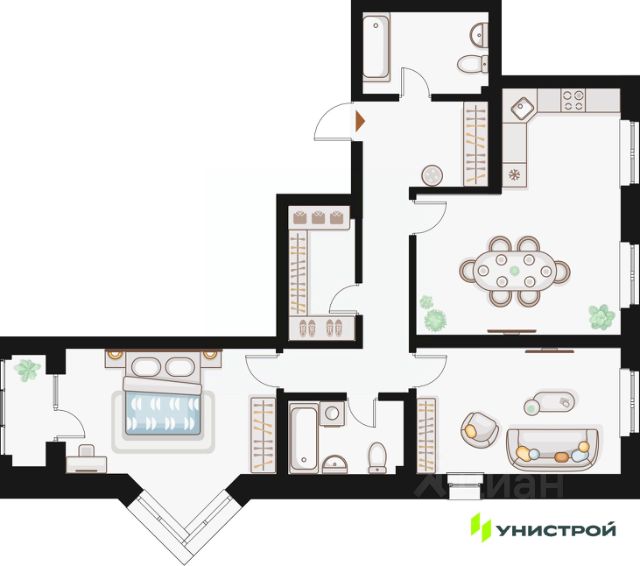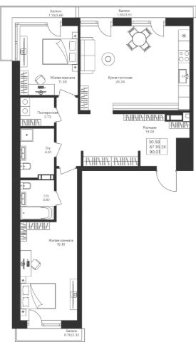 Уникум на Проспекте Победы "Уникум на Проспекте Победы" — проект от компании "Унистрой" в Казани. Жилой дом состоит из двух секций переменной высотности 7-25 этажей и гармонично вписывается в городское пространство. Жилой проект задает тренд на инклюзивную среду. Ту, в которой есть возможности для активной жизни и отдыха в пределах "Уникума". Проект отвечает ключевым запросам современного жителя большого города. Комфорт. Эстетика. И всё необходимое для успешной жизни рядом. "Уникум" — это лёгкая архитектура, стильное благоустройство и комфортное пространство для вашей жизни и отдыха. Развитый район "Уникум на Проспекте Победы" расположен в Советском районе Казани. Аэропорт находится в 25 минутах езды, ТЦ "Мега" и "Южный" в 10 минутах ходьбы, а остановка "Закиева" в двух минутах. В шаговой доступности фитнес-клубы, салоны красоты, медицинские центры и поликлиника. Для семей с детьми детский сад в доме, школы 156, 144, 167, 187 и 171 поблизости. Функциональность и эстетика "Уникум на Проспекте Победы" гармонично вписывается в городской ландшафт. Фасад в бежевых тонах с декоративным кирпичом соответствует современным требованиям к эстетике. На первых этажах коммерческие помещения для магазинов, кофеен и офисов, выполненные в едином стиле. Просторные холлы с высотой потолков 4,2 метра, подсветкой, современным дизайном и комфортной мебелью создают уютную атмосферу. Предусмотрены бесшумные скоростные лифты и колясочные с зарядками для электросамокатов. Входные группы из стекла, домофоны в теплом тамбуре, система грязезащиты и навигация обеспечивают удобство и безопасность. Френдли-среда и урбанистические тренды двора Двор "Уникума на Проспекте Победы" это френдли-среда, урбанистические тренды и баланс между отдыхом и работой. Жилой комплекс предлагает многообразие общественных пространств, а также фитнес-площадку, воркаут-зону, детские площадки для разных возрастов. Велопарковки у каждого подъезда, подземный паркинг и открытые машиноместа. Уникальные планировочные решения Жилой дом предлагает большое разнообразие планировок: студии, 1-комнатные, 2-комнатные (в том числе с европланировкой), просторные 3-комнатные. Квартиры с мастер-спальнями, гардеробными, видовые, с панорамными и угловыми окнами. Увеличенные оконные проёмы для создания светлого пространства. Лёгкое решение бытовых вопросов В "Уникуме на Проспекте Победы" обеспечивается подача чистой воды в каждую квартиру. Автоматическая передача данных учета воды, электричества и тепла в сервисную компанию через мобильное приложение. Электронные замки на входных дверях с дистанционным управлением. Паркинг "Уникум на Проспекте Победы" включает подземный паркинг со спуском на лифте. В нём 222 места для ваших автомобилей, 16 семейных и еще гостевые места. Паркинг, как и внутренний двор, охраняется и оборудован видеонаблюдением. Республика Татарстан, Казань, Проспект Победы , 001 кв.207 2-комнатная квартира, примерная площадь 90 м2 в Казани.