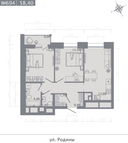 Продаётся 2-комнатная квартира в строящемся доме (Корпус 2), срок сдачи: I-кв. 2029, общей площадью 58.4 кв.м., на 20 этаже.