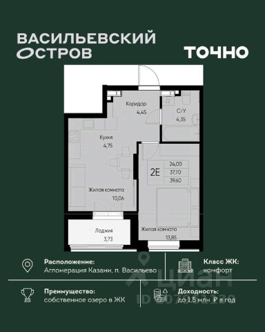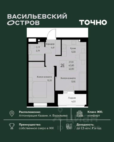В продаже двухкомнатная квартира 40 м² в Арске.