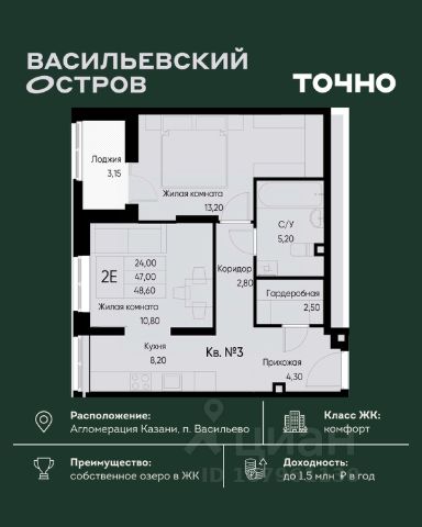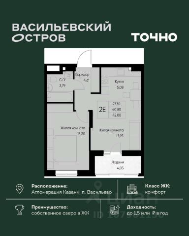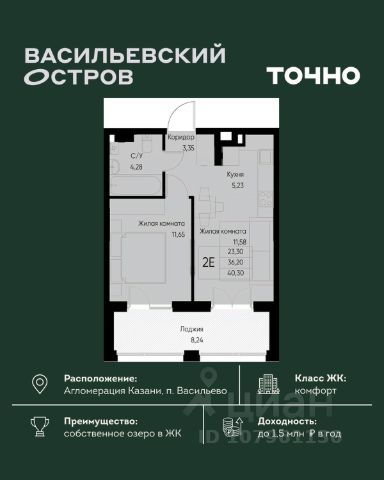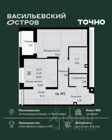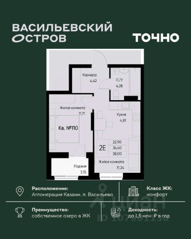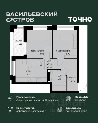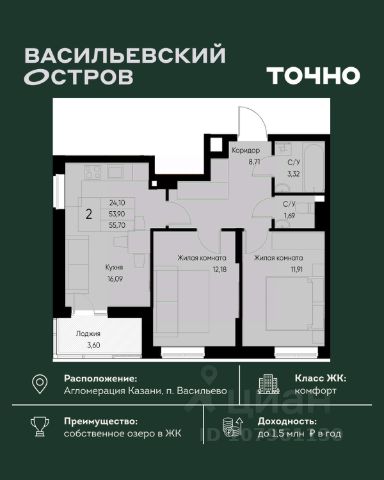 ЖК "Васильевский остров" — масштабный проект ТОЧНО в Казанской агломерации. Просторная территория 88 Га спроектирована для комфортной жизни: озеро с набережной и пляжем, каток, зелёные маршруты. В проекте комплекса — школа на 1 224 места, 2 детских сада на 680 мест, детская и взрослая поликлиники, фитнес-центр с бассейном, термальный комплекс, фермерский рынок, магазины, кафе и рестораны.