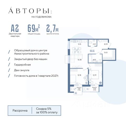Вы можете приобрести эту квартиру в ипотеку со ставкой от 6% (семейная ипотека). Новоселье уже в этом году! Подробнее - звоните! Продается 2-к квартира 67 в образцовом доме "Авторы на Годовикова" в центре Авиастроительного района. Квартира на 6 этаже площадью 67.4 м², кухней-гостиной и высотой потолков 2.7 м. Квартира сдается в предчистовой отделке со стяжкой полов, предоставляя полную свободу для ваших предпочтений в дизайне. Срок сдачи дома — 1-й квартал 2027 года. Возможно приобретение со скидкой 5% при полной оплате, в рассрочку с первым взносом 50%, а также оформление ипотеки. Образцовый дом "Авторы на Годовикова" расположен в тихой зоне, удаленной от активной дороги — на второй линии от улицы Максимова. Соседство с невысокими частными домами открывает превосходный вид из квартиры. Для прогулок на свежем воздухе в шаговой доступности Караваевский парк и парк "Крылья Советов". В соответствии с современными стандартами комфорт-класса "Авторы" предлагают особые решения для вашего комфорта: • Современная архитектура. • Закрытый двор без машин. • Дизайнерские холлы с зонами ожидания и детской комнатой. • Подземный паркинг. • Зона для хвостатых. Двор в концепции траектории полета создает единую линию движения. На территории дома есть многофункциональная зона для йоги и настольных игр, детская зона для комфортных прогулок юных жителей, многофункциональная спортивная площадка со скалолазанием и площадка для выгула собак. Обильное озеленение из 25 видов растений и несколько игровых зон для юных жителей разных возратов: для детей до 3-х лет — песочница, горка и качели; для детей от 4 до 14 лет — большой игровой комплекс, включающий горки, качели, карусели, переговорные трубы и мягкую геопластику, в которой прячутся тоннели. Компания "Авторы" — девелопер на рынке высококлассной недвижимости Казани. Как самостоятельный застройщик компания работает с 2022 года, а в начале 2024 года успешно сдали свой первый проект ЖК "Дом у озера", где 96% квартир были приняты дольщиками с первого раза и без критичных замечаний. Компания входит в ТОП-5 застройщиков РТ по потребительским качествам ЕРЗ. Сейчас компания ведет строительство проектов на ул. Большая, ул. Петербургская и ул. Годовикова