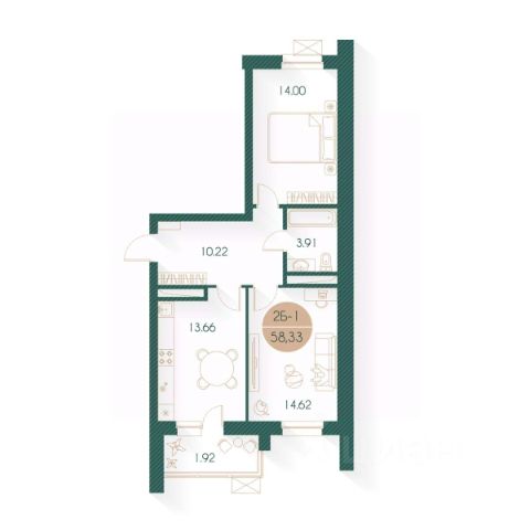 Продаётся 2-комнатная квартира в строящемся доме (Корпус 1), срок сдачи: II-кв. 2028, общей площадью 58.8 кв.м., на 14 этаже.