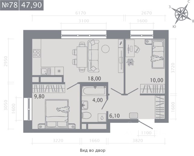 Продаётся 2-комнатная квартира в строящемся доме (Корпус 2), срок сдачи: I-кв. 2029, общей площадью 47.9 кв.м., на 17 этаже.