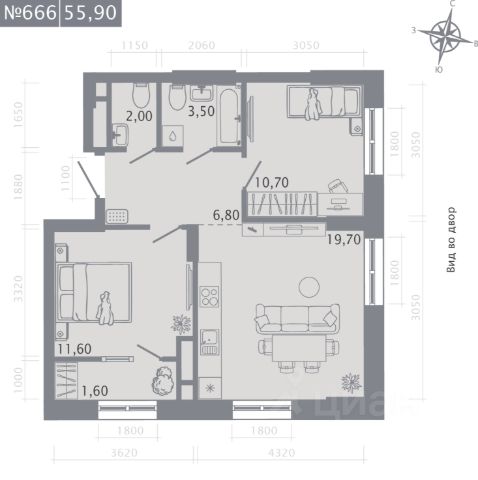 Продаётся 2-комнатная квартира в строящемся доме (Корпус 2), срок сдачи: I-кв. 2029, общей площадью 55.7 кв.м., на 9 этаже.