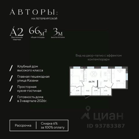 Продается 2-комнатная квартира на 1 этаже в ЖК Заря в центре города. ЗАРЯ новый жилой комплекс премиум-класса в самом центре Казани с продуманной до деталей инновационной архитектурой, дизайнерским гастродвориком, беспрецедентным гранд-лобби и умными решениями. ЖК "Заря" объединит 9 корпусов переменной этажности — от 4 до 8 этажей. Планировочные решения продуманы до мелочей: просторные кухни-гостиные, мастер-спальни с собственным санузлом и гардеробом. Нетиповые проекты квартир позволяют выбрать максимально подходящее пространство. Среди коллекционных квартир — эксклюзивные предложения с собственными террасами и патио, а также квартиры типа prive для особого формата жизни. Уникальным решением в сегменте премиального жилья Казани станет одно для всех корпусов гранд-лобби, доступное только для жителей ЖК и их гостей. В проекте предусмотрен дизайнерский гастродворик овальной формы. В нем разместятся кофейни с уличными столиками, кондитерская, фреш-маркет, флористический салон, студия фитнеса, модные рестораны и молодые, яркие бренды, уже успевшие влюбить в себя самых стильных. Украшением приватной внутренней территории комплекса станет просторный двор-сад и уникальные детские площадки. В гранд-лобби для детей младшего школьного возраста и подростков предусмотрен кабинет для онлайн-занятий и работы с репетиторами, а также зона для отдыха, где можно посмотреть фильм или поиграть в игры. Двухуровневая подземная парковка, с премиальной автомойкой, разместится под всей территорией жилого комплекса. Два отдельных въезда и выезда создадут дополнительное удобство, а увеличенные габариты парковочных мест позволят с легкостью парковаться даже на самых габаритных автомобилях.