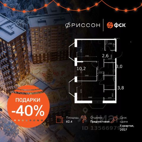 Продаётся 2-к квартира номер 395 общей площадью 62.4 кв.м. на 12-м этаже 14 этажного здания. Отделка Whitebox. Цена с учётом скидки.