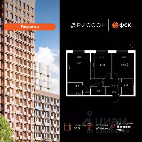 Продается двухкомнатная квартира в охраняемом жилом комплексе "Чистое небо" на 12-м этаже.