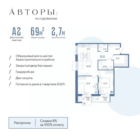 Продаётся 2-комн. квартира площадью 50,8 кв.м на 12 этаже 12 этажного дома (Корпус 3, Секция 2) проекта ПИК Сиберово. Светлый просторный подъезд на уровне земли, функциональная планировка, большие окна, предчистовая отделка. "Сиберово" - жилой квартал на улице Журналистов с парками в каждом дворе, школой и двумя детскими садами. До центра Казани - 15 минут пути на машине. Переменная высота домов от 7 до 26 этажей создаёт ощущение простора, а солнечному свету позволяет беспрепятственно проникать во дворы и квартиры. С верхних этажей откроется панорамный вид на реку Казанку, "Ак Барс Арену" и центр семьи "Казан". Жилой квартал отметили на форуме "Казаныш", где награждают лучшие архитектурные проекты Казани. В 2023 году проект оказался в двух номинациях: "Лучшее благоустройство территорий" и "Лучшая архитектурно-градостроительная подсветка". В "Сиберово" будет всё необходимое для комфортной жизни: на первых этажах разместятся магазины, кафе и полезные сервисы. Внутри жилого квартала запланировано строительство школы и двух детских садов. Для удобства жителей будут подземные паркинги в каждом доме, четыре наземных многоуровневых паркинга, индивидуальные кладовые и колясочные. В каждом дворе будет парк - тихое приватное пространство для жителей, где можно расслабиться после рабочего дня. Здесь красиво и уютно в любое время года. Через весь квартал протянется широкий пешеходный бульвар с велодорожками, велопарковками, зонами для отдыха, детскими и спортивными площадками. Входы в подъезды в "Сиберово" сделаны на уровне земли: по территории квартала удобно перемещаться и пешком, и на самокате, и с коляской. Первые этажи просторные и светлые: панорамное остекление пропускает много естественного света, а высота потолков доходит до пяти метров. Все квартиры сдаются в предчистовой отделке: с ровными белыми стенами, готовой гидроизоляцией, стяжкой полов, разводкой систем отопления, с окнами с надёжным пластиковым профилем. Вам останется только выбрать цвета и материалы для косметического ремонта, чтобы оформить квартиру на свой вкус. Вокруг "Сиберово" развитый район города: рядом детские сады, школы, колледж, поликлиники и торговые центры. До центра отсюда всего 15 минут на машине. Артикул 1025324 (Застройщик ООО "СЗ МТ ДЕВЕЛОПМЕНТ")