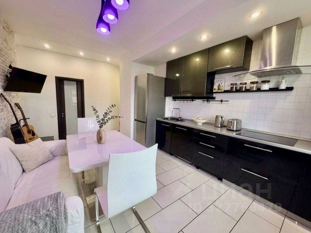 Кухня с островом и большим количеством хранения, здесь же нашлось место дивану и обеденному столу. Ну и телевизор, на котором сейчас все смотрят не новости, а фильмы с кинопоиска и других ресурсов. В потолке встроены динамики, так что большая кухня (20 метров) это не только место для встречи гостей, но и полноценная дискотека.