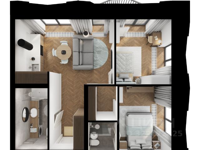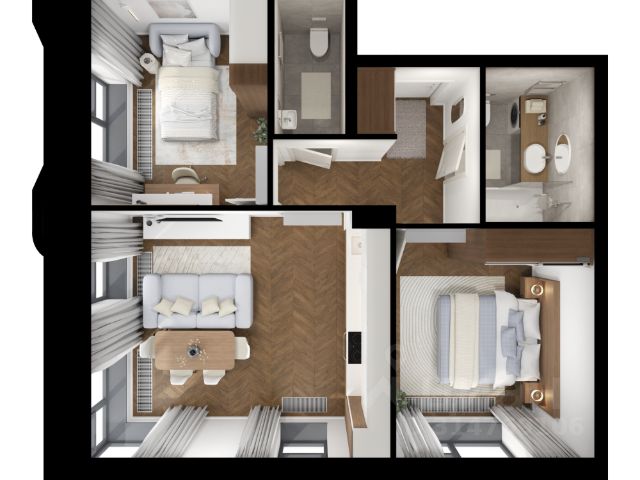 В квартире 2 просторные изолированные комнаты, 1 комната отведена полностью по гардеробную (можно сделать жилой), 2 раздельных сан. узла, встроенный шкаф в коридоре, большая кухня-гостиная, просторный холл. Есть два парковочных места на подземном паркинге прямо у лифта, самые большие и удобные места.