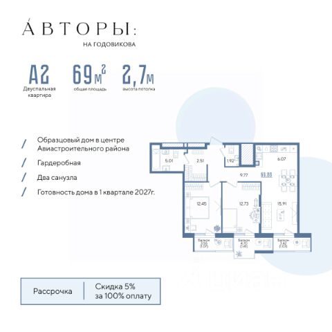 Вы можете приобрести эту квартиру в ипотеку со ставкой от 6% (семейная ипотека). Новоселье уже в этом году! Подробнее - звоните! Продается 2-к квартира 67 в образцовом доме "Авторы на Годовикова" в центре Авиастроительного района. Квартира на 6 этаже площадью 67.4 м², кухней-гостиной и высотой потолков 2.7 м. Квартира сдается в предчистовой отделке со стяжкой полов, предоставляя полную свободу для ваших предпочтений в дизайне. Срок сдачи дома — 1-й квартал 2027 года. Возможно приобретение со скидкой 5% при полной оплате, в рассрочку с первым взносом 50%, а также оформление ипотеки. Образцовый дом "Авторы на Годовикова" расположен в тихой зоне, удаленной от активной дороги — на второй линии от улицы Максимова. Соседство с невысокими частными домами открывает превосходный вид из квартиры. Для прогулок на свежем воздухе в шаговой доступности Караваевский парк и парк "Крылья Советов". В соответствии с современными стандартами комфорт-класса "Авторы" предлагают особые решения для вашего комфорта: • Современная архитектура. • Закрытый двор без машин. • Дизайнерские холлы с зонами ожидания и детской комнатой. • Подземный паркинг. • Зона для хвостатых. Двор в концепции траектории полета создает единую линию движения. На территории дома есть многофункциональная зона для йоги и настольных игр, детская зона для комфортных прогулок юных жителей, многофункциональная спортивная площадка со скалолазанием и площадка для выгула собак. Обильное озеленение из 25 видов растений и несколько игровых зон для юных жителей разных возратов: для детей до 3-х лет — песочница, горка и качели; для детей от 4 до 14 лет — большой игровой комплекс, включающий горки, качели, карусели, переговорные трубы и мягкую геопластику, в которой прячутся тоннели. Компания "Авторы" — девелопер на рынке высококлассной недвижимости Казани. Как самостоятельный застройщик компания работает с 2022 года, а в начале 2024 года успешно сдали свой первый проект ЖК "Дом у озера", где 96% квартир были приняты дольщиками с первого раза и без критичных замечаний. Компания входит в ТОП-5 застройщиков РТ по потребительским качествам ЕРЗ. Сейчас компания ведет строительство проектов на ул. Большая, ул. Петербургская и ул. Годовикова
