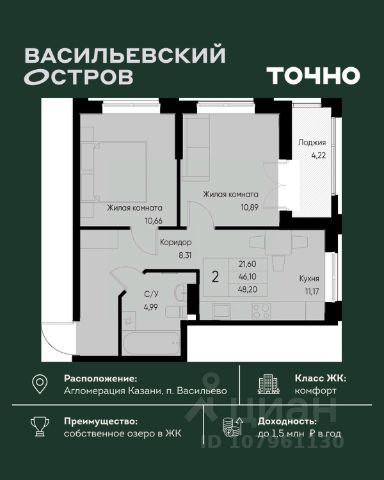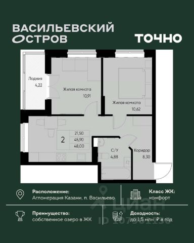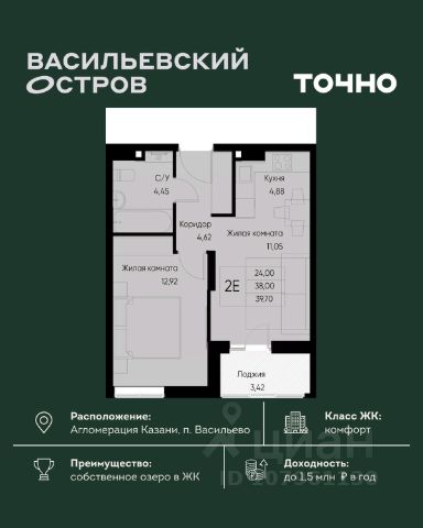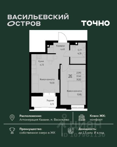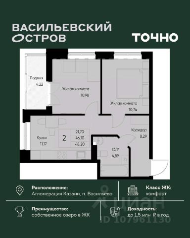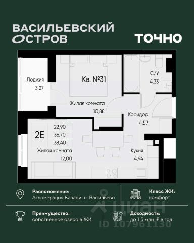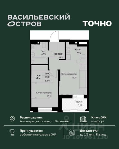 ЖК "Васильевский остров" — масштабный проект ТОЧНО в Казанской агломерации. Просторная территория 88 Га спроектирована для комфортной жизни: озеро с набережной и пляжем, каток, зелёные маршруты. В проекте комплекса — школа на 1 224 места, 2 детских сада на 680 мест, детская и взрослая поликлиники, фитнес-центр с бассейном, термальный комплекс, фермерский рынок, магазины, кафе и рестораны.