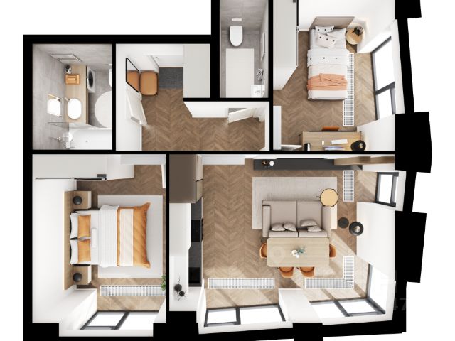 Планировка квартиры включает в себя просторную кухню 16 кв.м., две полноценные комнаты (спальня 14.80 кв.м. и гостиная 17.40 кв.м.), гардеробную 7.10 к в.м., совмещенный санузел 5.10 кв.м., прихожую 8.50 кв.м. Балкон с панорамным остеклением. Из окон открывается нереальный вид на озелененную центральную часть Казани!
