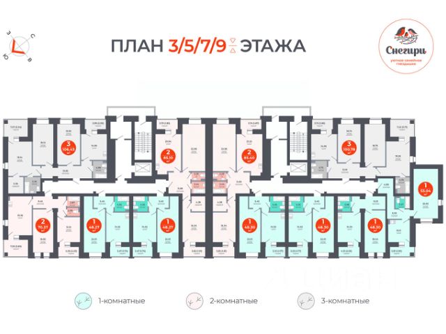 Санузел раздельный: 6,0 м2 и 3,0 м2 соответственно.