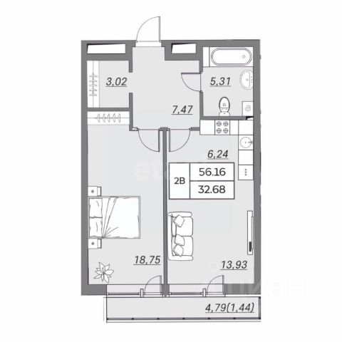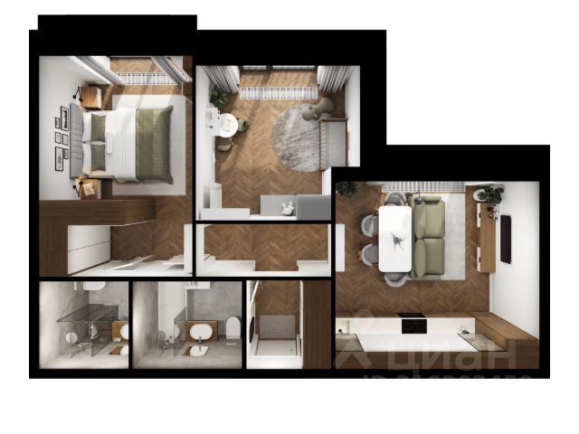Санузел раздельный: 6,0 м2 и 3,0 м2 соответственно.