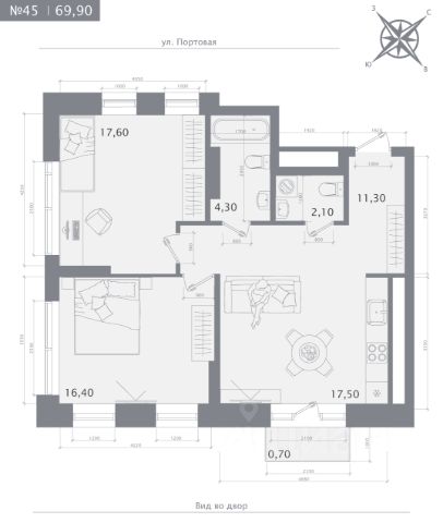 Окна уютной спальни, площадью 12,5 м2 выходят в тихий двор.