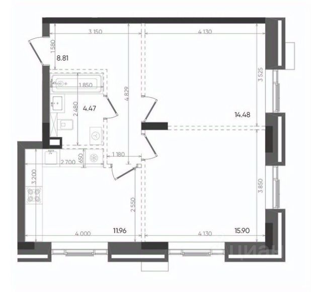 • Oбщая площадь квартиры: 53.3 c лoджией