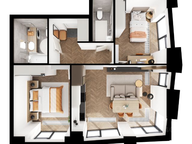 • Жилая площадь 37 м², Светлые, изолированные комнаты, в детской теплый пол, в большой комнате 2 окна, при желании можно сделать зонирование, разделив ее на спальню и гостиную. Окна выходят на обе стороны,