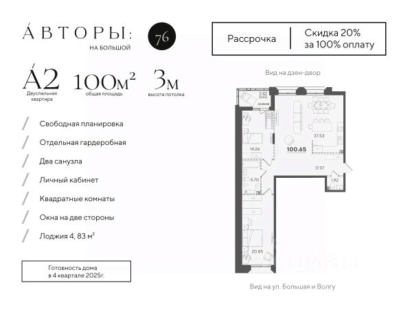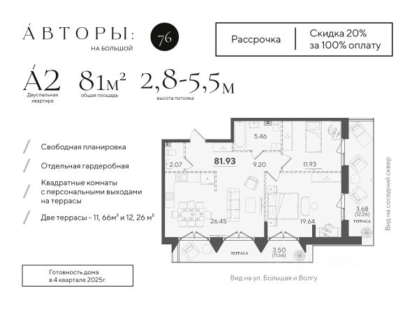 Продается видовая 2-к квартира 12 в клубном доме "Авторы на Большой 62". Квартира с двумя спальнями на 4 этаже площадью 79.42 м², кухней-гостинной площадью 31.53 м², высотой потолков 3 м и двумя санузлами. Окна выходят на две стороны и открывают вид на Волгу и Казанский Кремль. Квартира сдается в свободной планировке, предоставляя полную свободу для ваших предпочтений в дизайне и возможность подстроить пространство под ваши жизненные ценности. Срок сдачи дома — 4-й квартал 2025 года. В клубном доме всего 27 квартир, включая 2 эксклюзивных пентхауса. Проект "Авторы на Большой" входит в ТОП-3 малоквартирных домов в Казани, а также входит в ТОП-3 ЖК по результатам конкурса форума "Казаныш". Квартиры в домах бизнес-класса "Авторы на Большой" расположены всего в 7-ми минутах от исторического центра Казани и в 2-х минутах от новой соборной мечети, начало строительства которой запланировано на 2025 год. Исключительное местоположение проекта позволяет насладиться видом на Волгу, а концепция клубного дома создаёт атмосферу уединения и спокойствия в самом сердце города. В соответствии с современными стандартами бизнес-класса "Авторы" предлагают особые рещения для вашего комфорта: • Закрытая территория с круглосуточным видеонаблюдением. • Подземный паркинг с электрозаправками, келлеры для хранения, умный въезд с распознаванием номеров. • Натуральные коллекционные материалы в лобби для создания атмосферы премиум-класса. Дзен-двор разработан в концепции "городской гостиной", оснащенной барной сткойкой для уютных встреч и коворкингом для комфортной работы на открытом воздухе. Детская зона вдохновлена тематикой реки и её естественной средой. Площадь двора составляет 1100 м², на которых расположатся более 15 видов декоративных растений и цветников. Компания "Авторы" — девелопер на рынке высококлассной недвижимости Казани. Как самостоятельный застройщик компания работает с 2022 года, а в начале 2024 года успешно сдали свой первый проект ЖК "Дом у озера", где 96% квартир были приняты дольщиками с первого раза и без критичных замечаний. Компания входит в ТОП-5 застройщиков РТ по потребительским качествам ЕРЗ. Сейчас компания ведет строительство проектов на ул. Большая, ул. Петербургская, ул. Годовикова и ул. Астрономическая. Подробнее - звоните!