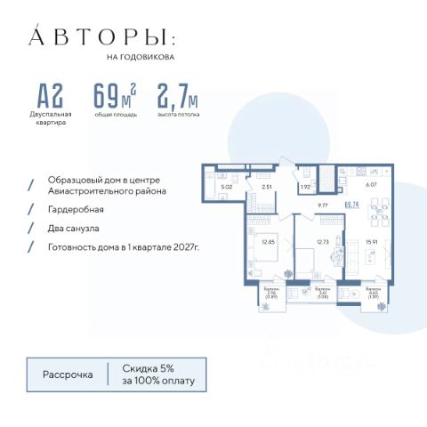 Вы можете приобрести эту квартиру в ипотеку со ставкой от 6% (семейная ипотека). Новоселье уже в этом году! Подробнее - звоните! Продается 2-к квартира 36 в образцовом доме "Авторы на Годовикова" в центре Авиастроительного района. Квартира на 2 этаже площадью 67.67 м², кухней-гостиной и высотой потолков 2.7 м. Квартира сдается в предчистовой отделке со стяжкой полов, предоставляя полную свободу для ваших предпочтений в дизайне. Срок сдачи дома — 1-й квартал 2027 года. Возможно приобретение со скидкой 5% при полной оплате, в рассрочку с первым взносом 30%, а также оформление стандартной ипотеки по интересным условиям. Образцовый дом "Авторы на Годовикова" расположен в тихой зоне, удаленной от активной дороги — на второй линии от улицы Максимова. Соседство с невысокими частными домами открывает превосходный вид из квартиры. Для прогулок на свежем воздухе в шаговой доступности Караваевский парк и парк "Крылья Советов". В соответствии с современными стандартами комфорт-класса "Авторы" предлагают особые решения для вашего комфорта: • Современная архитектура. • Закрытый двор без машин. • Дизайнерские холлы с зонами ожидания и детской комнатой. • Подземный паркинг. • Зона для хвостатых. Двор в концепции траектории полета создает единую линию движения. На территории дома есть многофункциональная зона для йоги и настольных игр, детская зона для комфортных прогулок юных жителей, многофункциональная спортивная площадка со скалолазанием и площадка для выгула собак. Обильное озеленение из 25 видов растений и несколько игровых зон для юных жителей разных возратов: для детей до 3-х лет — песочница, горка и качели; для детей от 4 до 14 лет — большой игровой комплекс, включающий горки, качели, карусели, переговорные трубы и мягкую геопластику, в которой прячутся тоннели. Компания "Авторы" — девелопер на рынке высококлассной недвижимости Казани. Как самостоятельный застройщик компания работает с 2022 года, а в начале 2024 года успешно сдали свой первый проект ЖК "Дом у озера", где 96% квартир были приняты дольщиками с первого раза и без критичных замечаний. Компания входит в ТОП-5 застройщиков РТ по потребительским качествам ЕРЗ. Сейчас компания ведет строительство проектов на ул. Большая, ул. Петербургская, ул. Годовикова и ул. Астрономическая