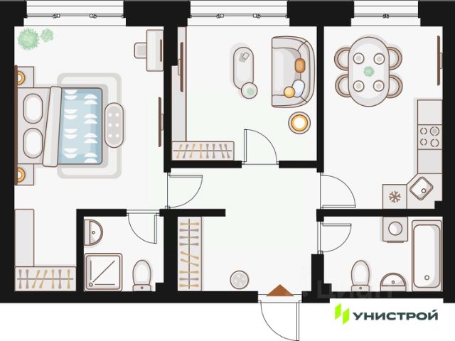 В комплексе 3 дома с закрытыми дворами без машин и доступа посторонних. Дворы соединены живописными бульварами. Прогулочные зоны ведут в парк и к озеру. Жители оценят  протяженность вело- и беговых маршрутов, а также близость магазинов, аптек, кафе, салонов красоты и ресторанов.