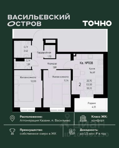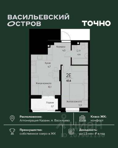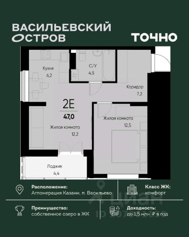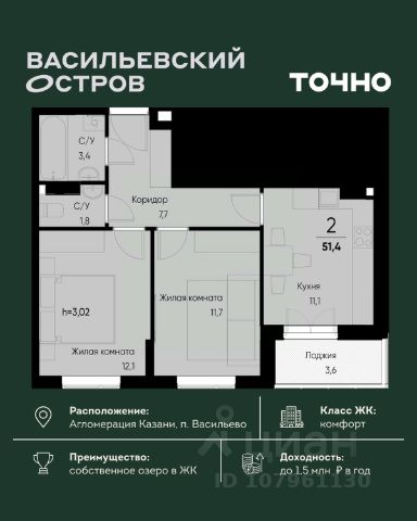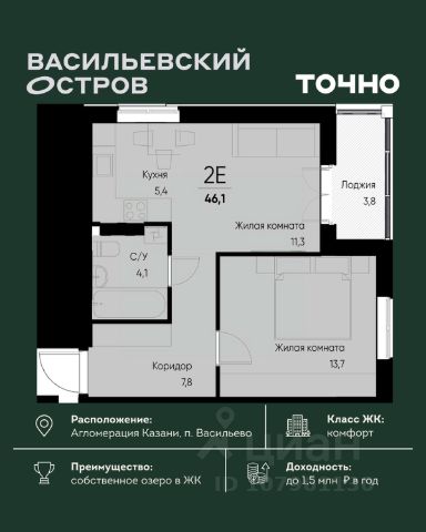 ЖК "Васильевский остров" — масштабный проект ТОЧНО в Казанской агломерации. Просторная территория 88 Га спроектирована для комфортной жизни: озеро с набережной и пляжем, каток, зелёные маршруты. В проекте комплекса — школа на 1 224 места, 2 детских сада на 680 мест, детская и взрослая поликлиники, фитнес-центр с бассейном, термальный комплекс, фермерский рынок, магазины, кафе и рестораны.