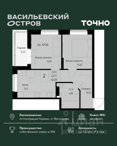 ЖК "Васильевский остров" — масштабный проект ТОЧНО в Казанской агломерации. Просторная территория 88 Га спроектирована для комфортной жизни: озеро с набережной и пляжем, каток, зелёные маршруты. В проекте комплекса — школа на 1 224 места, 2 детских сада на 680 мест, детская и взрослая поликлиники, фитнес-центр с бассейном, термальный комплекс, фермерский рынок, магазины, кафе и рестораны.