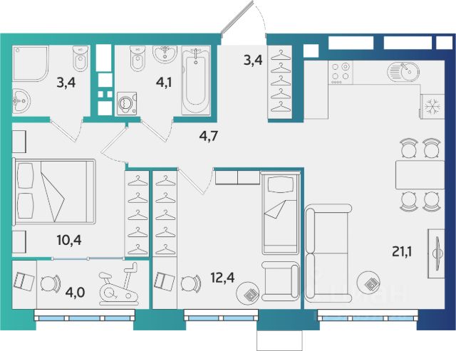Общая площадь 55,3 м2., по ЖК (отапливаемые площади, без двух балконов), также есть подвальное помещение для хранения иных вещей.