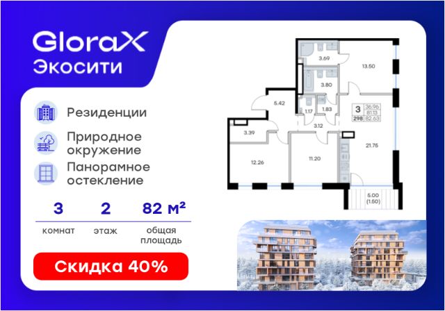 Продается 3-комн. квартира на 2-м этаже в строящемся проекте GloraX Экосити. Общая площадь лота составляет 82,63 кв. м, из которых 36,96 кв. м отведено под жилую и 21,75 кв. м под кухонную зону. Номер квартиры - 298