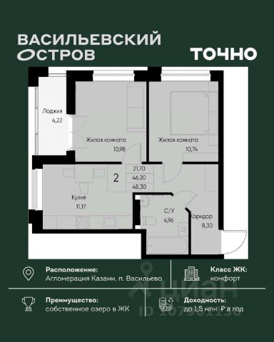 ЖК "Васильевский остров" — масштабный проект ТОЧНО в Казанской агломерации. Просторная территория 88 Га спроектирована для комфортной жизни: озеро с набережной и пляжем, каток, зелёные маршруты. В проекте комплекса — школа на 1 224 места, 2 детских сада на 680 мест, детская и взрослая поликлиники, фитнес-центр с бассейном, термальный комплекс, фермерский рынок, магазины, кафе и рестораны.